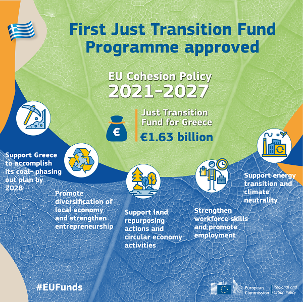 Χάρη στο πρώτο πρόγραμμα του Ταμείου Δίκαιης Μετάβασης (ΤΔΜ) που εγκρίθηκε σήμερα από την Επιτροπή, η Ελλάδα θα κινητοποιήσει συνολική επένδυση ύψους 1,63 δισ. ευρώ για την άμβλυνση των επιπτώσεων της ενεργειακής και κλιματικής μετάβασης στην τοπική οικονομία και κοινωνία. Το ελληνικό σχέδιο θα επωφεληθεί από επιχορηγήσεις ύψους 1,38 δισ. ευρώ από το ΤΔΜ.