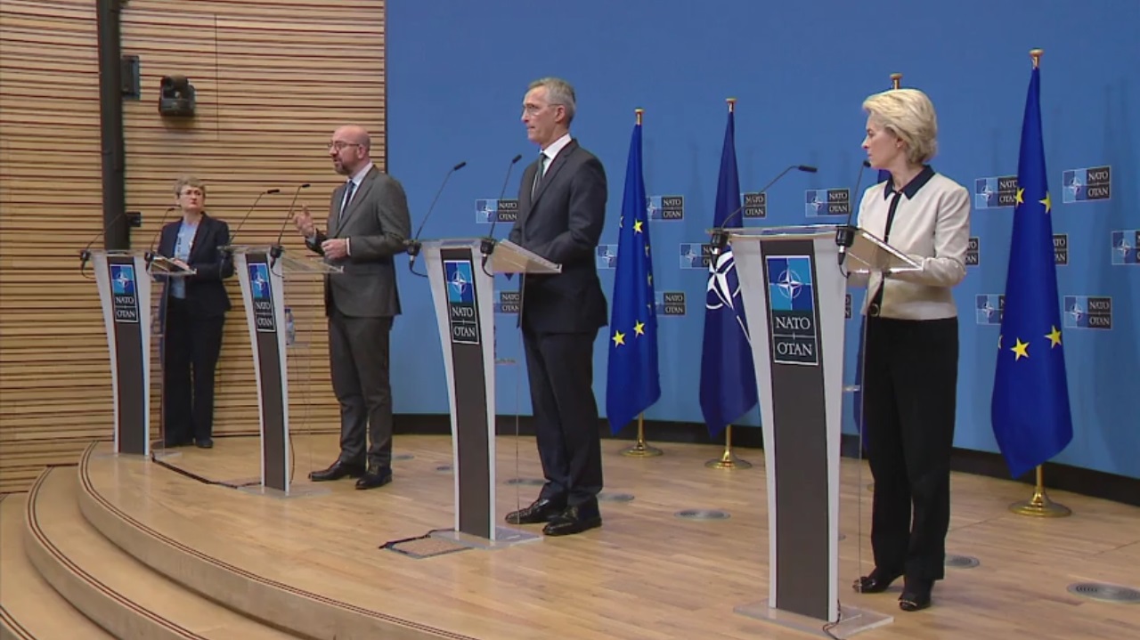 Βρισκόμαστε σε σημείο καμπής. Είμαστε εδώ και οι τρεις, ενωμένοι. Αυτό εκφράζει, ακόμα πιο έντονα, την κοινή αντίδραση Ευρωπαϊκής Ένωσης και ΝΑΤΟ στις ενέργειες του Κρεμλίνου. Όλος ο κόσμος μπορεί να δει ότι η δύναμή μας είναι η ενότητά μας.