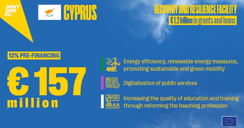 Η Ευρωπαϊκή Επιτροπή εκταμίευσε 157 εκατ. ευρώ με τη μορφή προχρηματοδότησης για την Κύπρο. Το ποσό αντιστοιχεί στο 13 % της συνιστώσας επιχορηγήσεων και δανείων του χρηματοδοτικού κονδυλίου της χώρας. Η καταβολή προχρηματοδότησης στο πλαίσιο του μηχανισμού ανάκαμψης και ανθεκτικότητας (RRF) θα βοηθήσει στην έναρξη της εφαρμογής των κρίσιμων επενδυτικών και μεταρρυθμιστικών μέτρων που περιγράφονται στο σχέδιο ανάκαμψης και ανθεκτικότητας της Κύπρου.