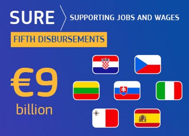 Η Ευρωπαϊκή Επιτροπή εκταμίευσε 9 δισ. ευρώ σε επτά κράτη μέλη με την πέμπτη δόση χρηματοδοτικής στήριξης προς τα κράτη μέλη στο πλαίσιο του μέσου SURE. Πρόκειται για τη δεύτερη εκταμίευση το 2021. Στο πλαίσιο των σημερινών πράξεων, η Τσεχία έλαβε 1 δισ. ευρώ, η Ισπανία 2,87 δισ. ευρώ, η Κροατία 510 εκατ. ευρώ, η Ιταλία 3,87 δισ. ευρώ, η Λιθουανία 302 εκατ. ευρώ, η Μάλτα 123 εκατ. ευρώ και η Σλοβακία 330 εκατ. ευρώ. Είναι η πρώτη φορά που η Τσεχία λαμβάνει χρηματοδότηση στο πλαίσιο του μέσου. Οι άλλες έξι χώρες της ΕΕ έχουν ήδη λάβει δάνεια στο πλαίσιο του SURE.