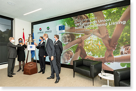 Λουξεμβούργο, 27 Οκτωβρίου 2020: Παρουσία του Ευρωπαίου επιτρόπου Προϋπολογισμού και Διοίκησης, κ. Γιοχάνες Χαν, και του πρωθυπουργού του Λουξεμβούργου, κ. Ξάβιε Μπέτελ, εισήχθη σήμερα στο χρηματιστήριο του Λουξεμβούργου (LuxSE) το πρώτο κοινωνικό ομόλογο που εκδόθηκε στο πλαίσιο του προγράμματος EU SURE. Στις αρχές του τρέχοντος έτους, η ΕΕ θέσπισε το μέσο SURE (στήριξη για τον μετριασμό των κινδύνων ανεργίας σε κατάσταση έκτακτης ανάγκης) για να συμβάλει στην προστασία των θέσεων εργασίας και των εργαζομένων σε ολόκληρη την Ευρώπη, που έχουν πληγεί σοβαρά από την πανδημία COVID-19. Το κοινωνικό ομόλογο θα εμφανίζεται στο πράσινο χρηματιστήριο του Λουξεμβούργου (LGX).