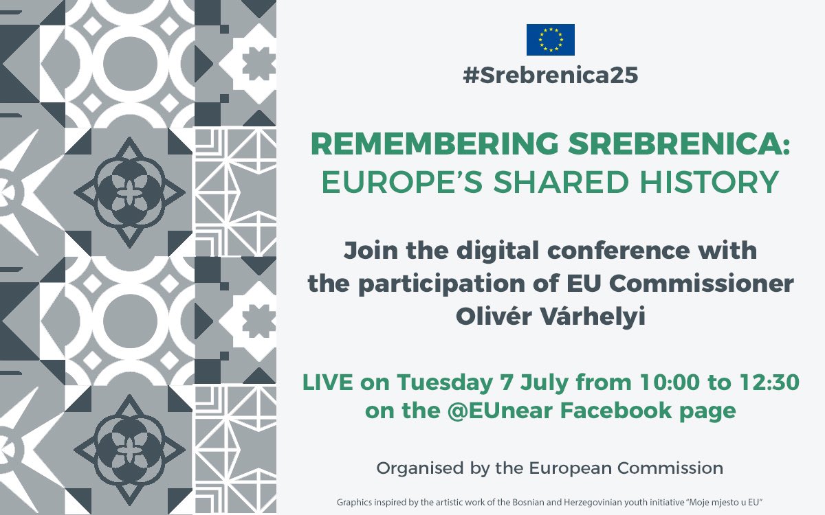 Την Τρίτη 7 Ιουλίου, η Επιτροπή διοργανώνει μια ψηφιακή διάσκεψη για την 25η επέτειο της γενοκτονίας της Σρεμπρένιτσα (#Srebrenica25), η οποία θα εορταστεί επισήμως στις 11 Ιουλίου.