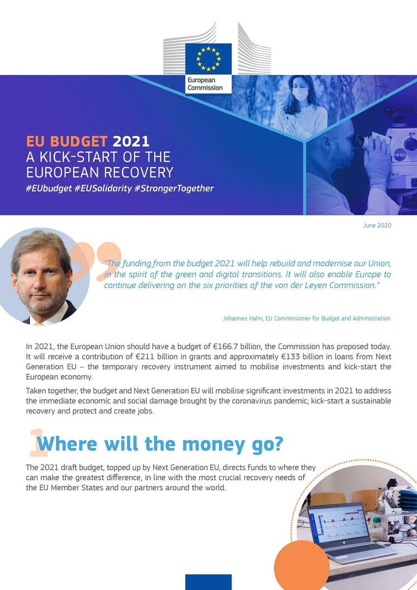 Η Επιτροπή πρότεινε τον προϋπολογισμό της ΕΕ για το 2021 ύψους 166,7 δισ. ευρώ, ποσό το οποίο θα συμπληρωθεί με 211 δισ. ευρώ υπό μορφή επιχορηγήσεων και περίπου 133 δισ. ευρώ υπό μορφή δανείων στο πλαίσιο του προσωρινού μέσου ανάκαμψης, Next Generation EU, που έχει ως στόχο την κινητοποίηση επενδύσεων και την επανεκκίνηση της ευρωπαϊκής οικονομίας. Από κοινού, ο ετήσιος προϋπολογισμός και το Next Generation EU θα κινητοποιήσουν σημαντικές επενδύσεις το 2021 για την αντιμετώπιση των άμεσων οικονομικών και κοινωνικών ζημιών που έχει προκαλέσει η πανδημία του κορονοϊού, την εκκίνηση της βιώσιμης ανάκαμψης και την προστασία και δημιουργία θέσεων εργασίας. Επίσης, ο προϋπολογισμός ευθυγραμμίζεται πλήρως με τη δέσμευση επένδυσης στο μέλλον, προκειμένου να επιτευχθεί μια πιο πράσινη, πιο ψηφιακή και ανθεκτική Ευρώπη.
