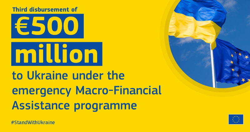 Η Επιτροπή εκταμίευσε την τρίτη και τελευταία δόση ύψους 500 εκατ. ευρώ στο πλαίσιο της δέσμης έκτακτης μακροοικονομικής χρηματοδοτικής συνδρομής (ΜΧΣ) ύψους 5 δισ. ευρώ για την Ουκρανία. Η εκταμίευση αυτή αποτελεί μέρος της δέσμης μέτρων ΜΧΣ, που ανακοινώθηκε από την Επιτροπή στην ανακοίνωση της 18ης Μαΐου και εγκρίθηκε από το Ευρωπαϊκό Συμβούλιο στις 23-24 Ιουνίου 2022.