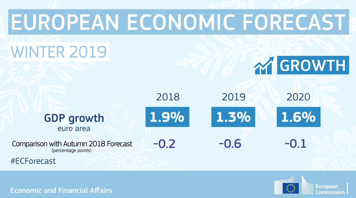 Η ευρωπαϊκή οικονομία αναμένεται να σημειώσει ανάπτυξη για έβδομη συνεχή χρονιά το 2019, με πρόβλεψη για επέκταση σε όλα τα κράτη μέλη. Ο ρυθμός ανάπτυξης συνολικά προβλέπεται να είναι συγκρατημένος σε σύγκριση με τα υψηλά ποσοστά των τελευταίων ετών και οι προοπτικές χαρακτηρίζονται από μεγάλη αβεβαιότητα.