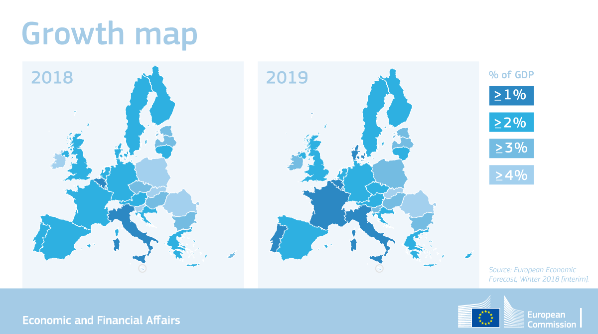 Η ανάπτυξη αναμένεται να παραμείνει ισχυρή το 2018 και το 2019, με ρυθμούς 2,1 % φέτος και 2 % το επόμενο έτος στην ΕΕ και στη ζώνη του ευρώ αντίστοιχα.