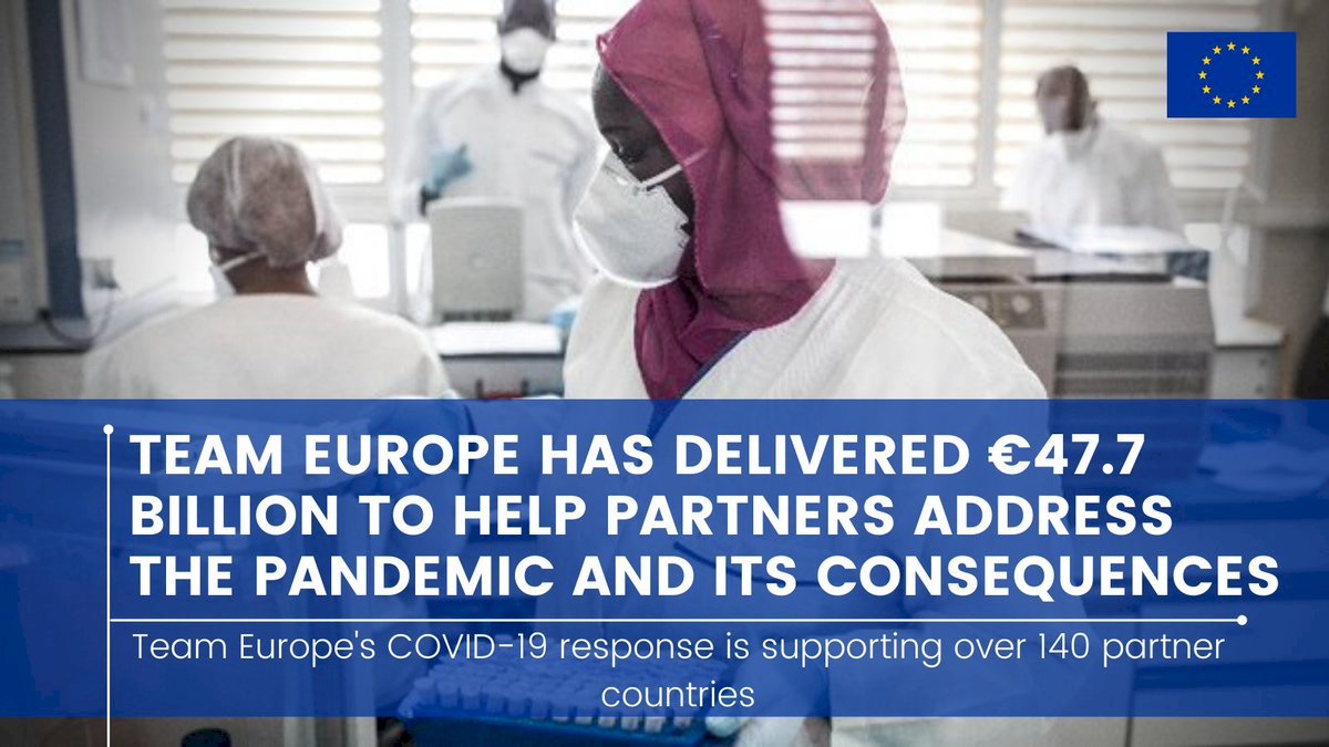 Από την έξαρση της νόσου COVID-19 στις αρχές του 2020 μέχρι σήμερα, η ΕΕ, τα κράτη μέλη της ΕΕ και τα ευρωπαϊκά χρηματοπιστωτικά ιδρύματα, ως «Ομάδα Ευρώπη», έχουν εκταμιεύσει 47,7 δισ. ευρώ για να στηρίξουν τις χώρες-εταίρους στην αντιμετώπιση της πανδημίας και των συνεπειών της, υλοποιώντας τις υποσχέσεις τους με απτά αποτελέσματα. Αυτό το ποσό ήδη υπερβαίνει κατά πολύ την αρχική δέσμη στήριξης της «Ομάδας Ευρώπη», ύψους 20 δισ. ευρώ, που αποτέλεσε αντικείμενο δέσμευσης την άνοιξη του 2020, και έχει πλέον αυξηθεί σε 53,7 δισ. ευρώ.