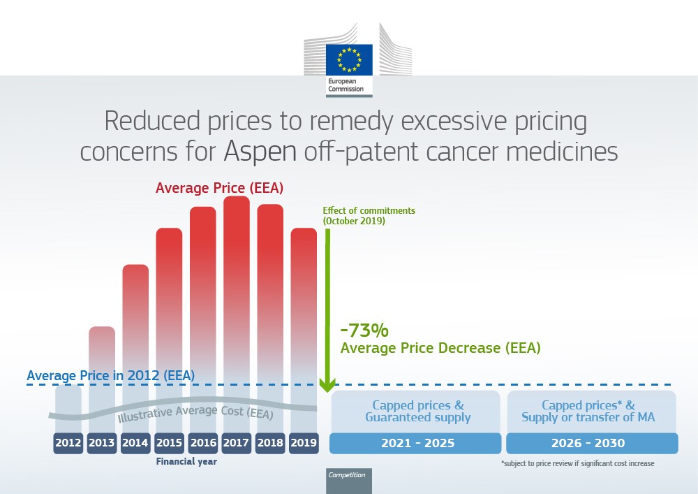 Η Ευρωπαϊκή Επιτροπή κατέστησε τις δεσμεύσεις που πρότεινε η Aspen νομικά δεσμευτικές στο πλαίσιο των αντιμονοπωλιακών κανόνων της ΕΕ. Η Aspen πρέπει να μειώσει τις τιμές της στην Ευρώπη, για έξι αντικαρκινικά φάρμακα κρίσιμης σημασίας, κατά 73 % κατά μέσο όρο. Επιπλέον, η Aspen πρέπει να εξασφαλίσει τη συνεχή προμήθεια αυτών των φαρμάκων που δεν καλύπτονται από δίπλωμα ευρεσιτεχνίας για σημαντικό χρονικό διάστημα.