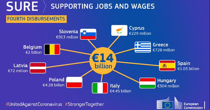 Η Ευρωπαϊκή Επιτροπή εκταμίευσε 14 δισ. ευρώ σε εννέα κράτη μέλη με την τέταρτη δόση χρηματοδοτικής στήριξης προς τα κράτη μέλη στο πλαίσιο του μέσου SURE. Πρόκειται για την πρώτη εκταμίευση το 2021. Στο πλαίσιο των σημερινών πράξεων, το Βέλγιο έλαβε 2 δισ. ευρώ, η Κύπρος 229 εκατ. ευρώ, η Ουγγαρία 304 εκατ. ευρώ, η Λετονία 72 εκατ. ευρώ, η Πολωνία 4,28 δισ. ευρώ, η Σλοβενία 913 εκατ. ευρώ, η Ισπανία 1,03 δισ. ευρώ, η Ελλάδα 728 εκατ. ευρώ και η Ιταλία 4,45 δισ. ευρώ. Και τα εννέα κράτη μέλη είχαν ήδη λάβει χρηματοδοτική στήριξη στο πλαίσιο του SURE το 2020, στο πλαίσιο μίας από τις τρεις πρώτες εκδόσεις και πράξεις εκταμίευσης που πραγματοποιήθηκαν το 2020.