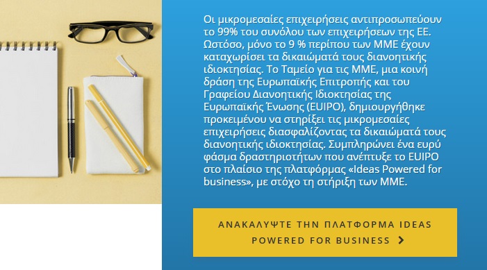 Με την υποστήριξη της Επιτροπής και του Γραφείου Διανοητικής Ιδιοκτησίας της Ευρωπαϊκής Ένωσης (EUIPO), το πρόγραμμα Ideas Powered for Business SME Fund έχει στόχο να βοηθήσει τις επιχειρήσεις να αναπτύξουν στρατηγικές ΔΙ και να προστατεύσουν τα δικαιώματα ΔΙ τους σε εθνικό και ενωσιακό επίπεδο.