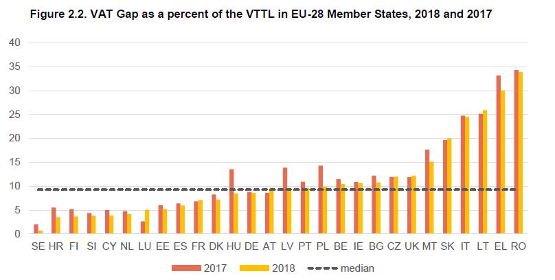 Σε ονομαστικούς όρους, το συνολικό έλλειμμα ΦΠΑ της ΕΕ μειώθηκε ελαφρά, κατά σχεδόν 1 δισ. ευρώ, σε 140,04 δισ. ευρώ το 2018, υποχωρώντας από μείωση κατά 2,9 δισ. ευρώ το 2017. Αυτή η πτωτική τάση αναμενόταν να συνεχιστεί για ένα ακόμη έτος, αν και η πανδημία του κορονοϊού είναι πιθανό να αναστρέψει τη θετική τάση.