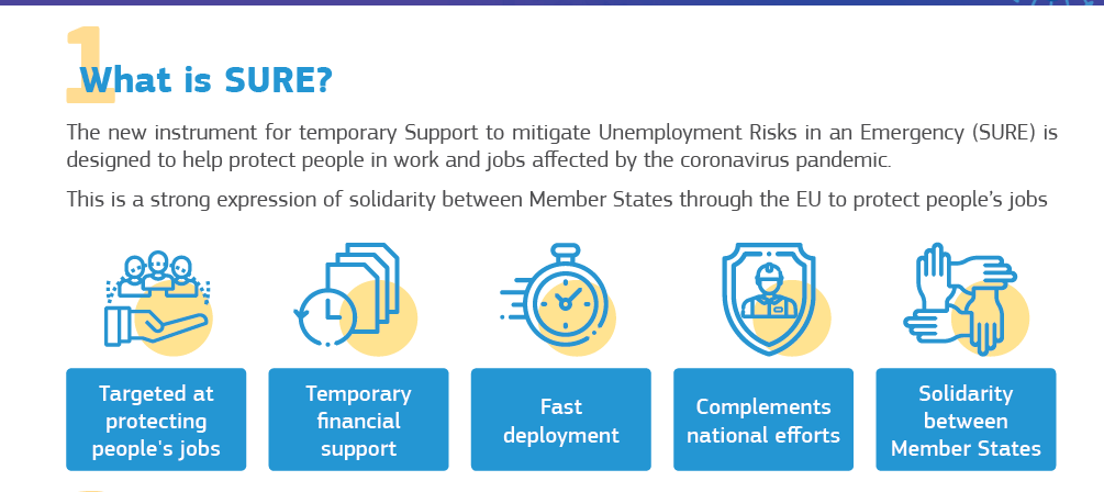 Το νέο μέσο προσωρινής στήριξης για τον μετριασμό των κινδύνων ανεργίας σε κατάσταση έκτακτης ανάγκης (SURE – Support to mitigate Unemployment Risks in an Emergency) αποσκοπεί στην προστασία των θέσεων εργασίας και των εργαζομένων που πλήττονται από την πανδημία του κορονοϊού. Θα παρέχει χρηματοδοτική συνδρομή, ύψους έως 100 δισ. ευρώ συνολικά, υπό μορφή δανείων χορηγούμενων με ευνοϊκούς όρους από την ΕΕ προς τα κράτη μέλη. Τα δάνεια αυτά θα βοηθήσουν τα κράτη μέλη να αντεπεξέλθουν σε τυχόν αιφνίδια αύξηση των δημόσιων δαπανών για τη διατήρηση της απασχόλησης. Συγκεκριμένα, τα δάνεια αυτά θα βοηθήσουν τα κράτη μέλη να καλύψουν τις δαπάνες που συνδέονται άμεσα με τη δημιουργία ή την επέκταση εθνικών συστημάτων μειωμένου ωραρίου και άλλων παρόμοιων μέτρων που έχουν θεσπίσει για τους αυτοαπασχολούμενους ως απάντηση στην τρέχουσα πανδημία του κορονοϊού.