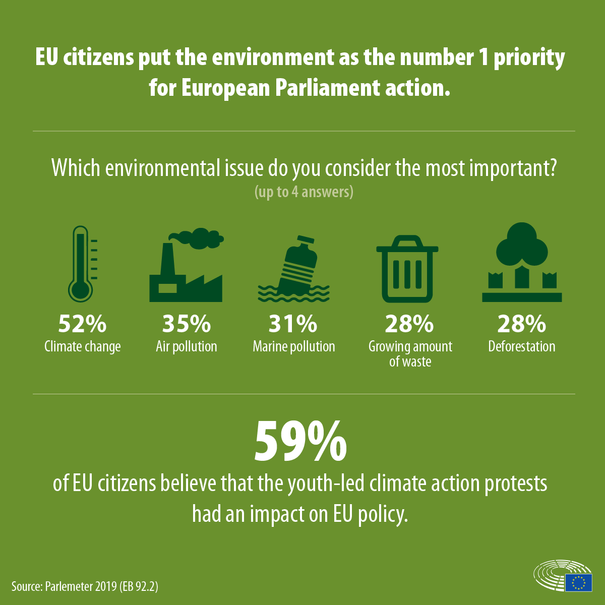 Σύμφωνα με νέα έρευνα του Ευρωβαρόμετρου, το 94 % των πολιτών σε όλα τα κράτη μέλη της ΕΕ δηλώνουν ότι η προστασία του περιβάλλοντος είναι σημαντική για τους ίδιους. Επιπλέον, το 91 % των πολιτών δήλωσαν ότι η κλιματική αλλαγή αποτελεί σοβαρό πρόβλημα στην ΕΕ. Η ευρωπαϊκή νομοθεσία είναι απαραίτητη για την προστασία του περιβάλλοντος, σύμφωνα με το 83 % των ερωτηθέντων.
