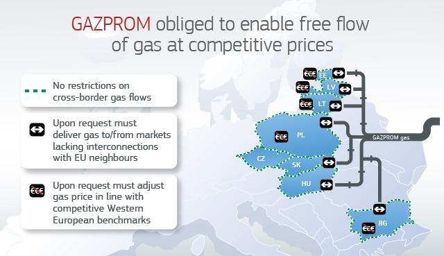 Η Ευρωπαϊκή Επιτροπή εξέδωσε απόφαση με την οποία επιβάλλει στη Gazprom σειρά υποχρεώσεων που διαλύουν τις ανησυχίες της Επιτροπής σχετικά με τον ανταγωνισμό και καθιστούν δυνατή την ελεύθερη ροή φυσικού αερίου σε ανταγωνιστικές τιμές στις αγορές αερίου της Κεντρικής και Ανατολικής Ευρώπης, προς όφελος των Eυρωπαίων καταναλωτών και των ευρωπαϊκών επιχειρήσεων.