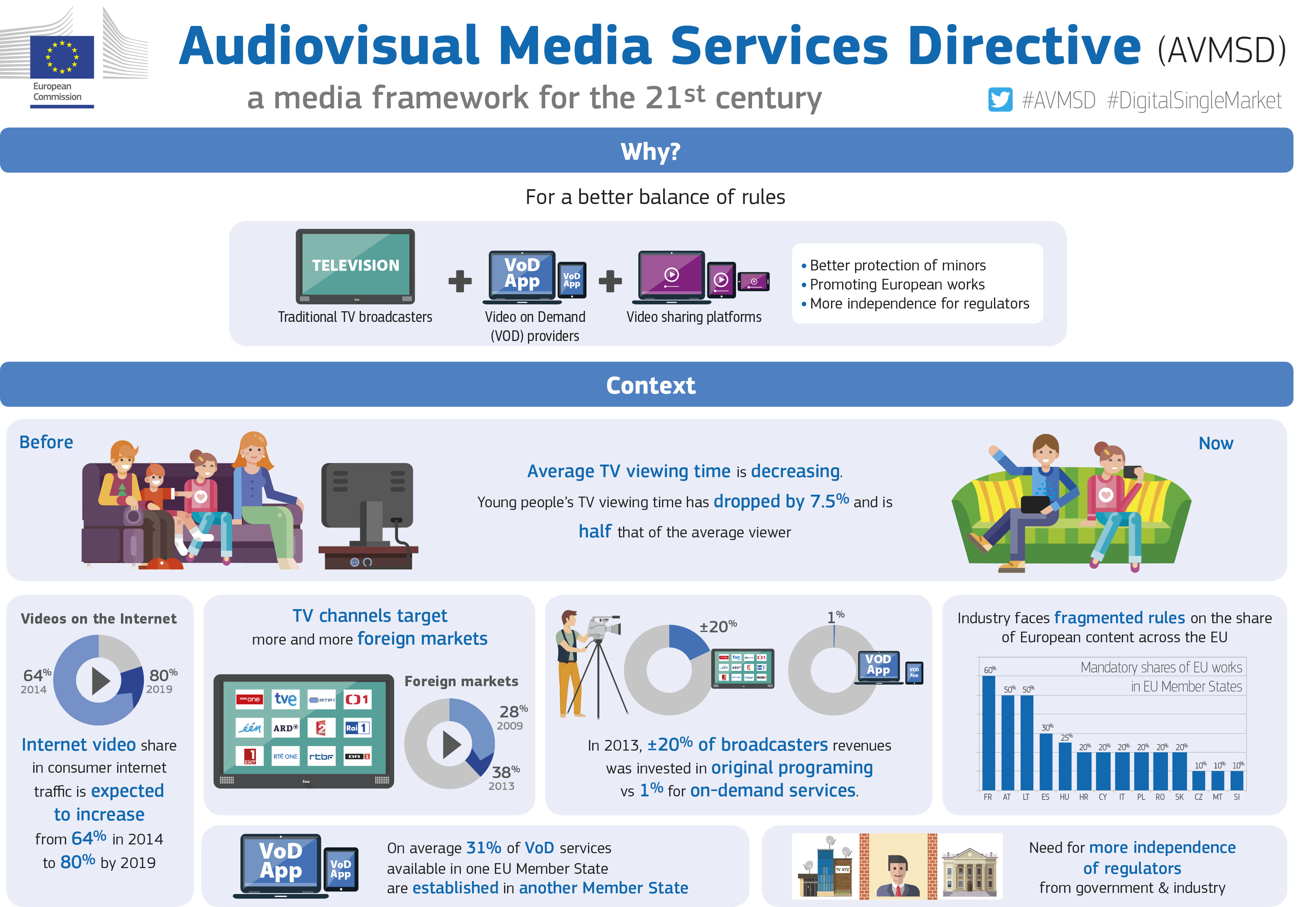 Η συμφωνία ανοίγει τον δρόμο προς ένα πιο δίκαιο κανονιστικό περιβάλλον για το σύνολο του οπτικοακουστικού τομέα, συμπεριλαμβανομένων των κατά παραγγελία υπηρεσιών και των πλατφορμών ανταλλαγής βίντεο. Οι νέοι κανόνες ενισχύουν την προστασία των ανηλίκων και τον αγώνα κατά της ρητορικής μίσους σε όλο το οπτικοακουστικό περιεχόμενο. Προωθούν τις ευρωπαϊκές οπτικοακουστικές παραγωγές και εγγυώνται την ανεξαρτησία των ρυθμιστικών αρχών του οπτικοακουστικού τομέα.