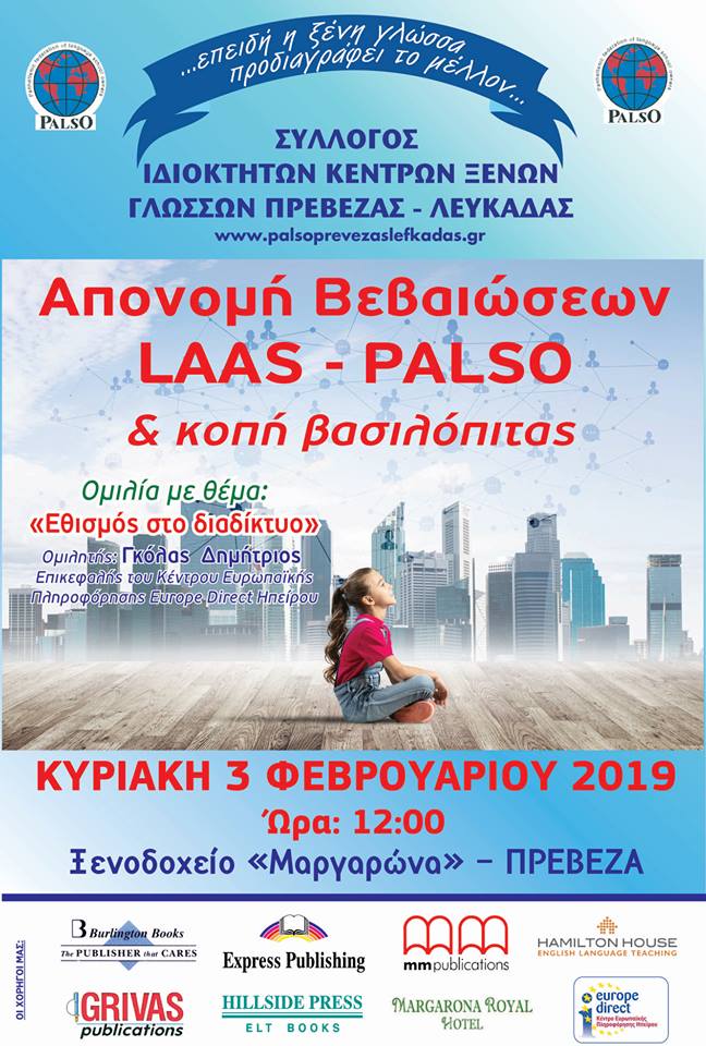 Ο ΣΥΛΛΟΓΟΣ ΙΔΙΟΚΤΗΤΩΝ ΚΕΝΤΡΩΝ ΓΛΩΣΣΩΝ ΠΡΕΒΕΖΑΣ - ΛΕΥΚΑΔΑΣ σας προσκαλεί  στην απονομή Βεβαιώσεων LAAS - PALSO και την κοπή της βασιλόπιτας του συλλόγου.