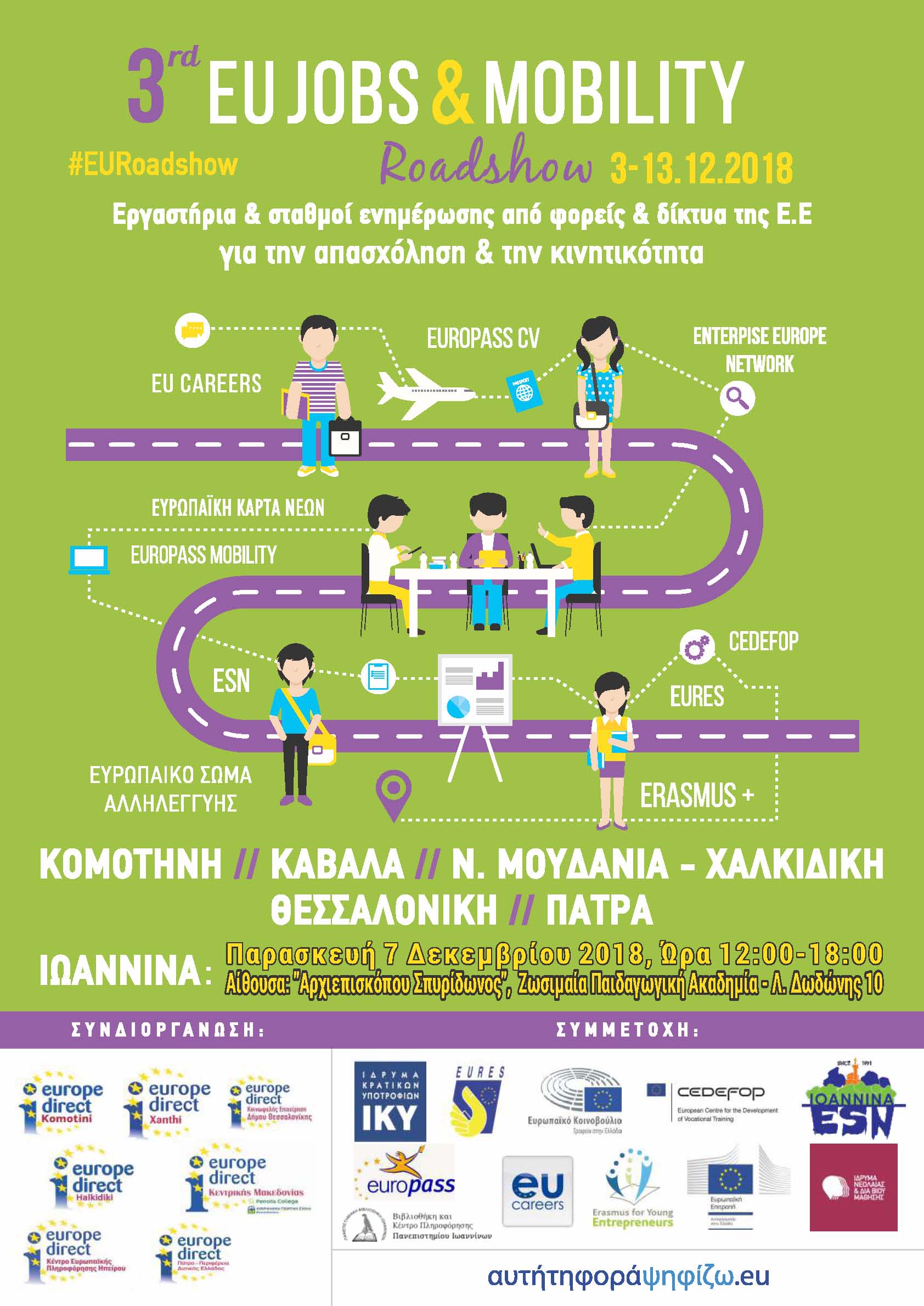 Επτά Κέντρα Ευρωπαϊκής Πληροφόρησης - Europe Direct (Κομοτηνής, Ξάνθης, Θεσσαλονίκης -ΚΕΔΗΘ, Κεντρικής Μακεδονίας, Χαλκιδικής, Ηπείρου και Πάτρας) συν-διοργανώνουν το “3ο European Job & Mobility Roadshow” σε έξι πόλεις  της Ανατολικής Μακεδονίας – Θράκης, της Κεντρικής Μακεδονίας, της Ηπείρου, και της Δυτικής Ελλάδας, από τις 3 έως τις 13 Δεκεμβρίου 2018.