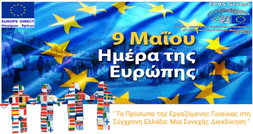 Στα πλαίσια των εορταστικών εκδηλώσεων (Ευρωπαϊκής Επιτροπής και Ευρωπαϊκού Κοινοβουλίου) για την «9η Μαΐου – Ημέρα της Ευρώπης», το 1ο ΓΕΝΙΚΟ ΛΥΚΕΙΟ ΦΙΛΙΠΠΙΑΔΟΣ, (http://1lyk-filipp.pre.sch.gr/),  ΣΧΟΛΕΙΟ ΠΡΕΣΒΕΥΤΗΣ του ΕΥΡΩΠΑΪΚΟΥ ΚΟΙΝΟΒΟΥΛΙΟΥ (https://www.europarl.europa.eu/ambassador-school/el/) στην περιοχή Άρτας και Πρέβεζας, σε συνεργασία με το ΚΕΝΤΡΟ ΕΥΡΩΠΑΪΚΗΣ ΠΛΗΡΟΦΟΡΗΣΗΣ –EUROPE DIRECT- ΗΠΕΙΡΟΥ (www.europedirect.gr), συνδιοργανώνουν εκδήλωση την Δευτέρα 9η Μαΐου, 10:30 -13:00, στην αίθουσα εκδηλώσεων του Δημαρχείου Φιλιππιάδας με Θέμα : “Τα Πρόσωπα της Εργαζόμενης Γυναίκας στη σύγχρονη Ελλάδα: Μία Συνεχής Διεκδίκηση”